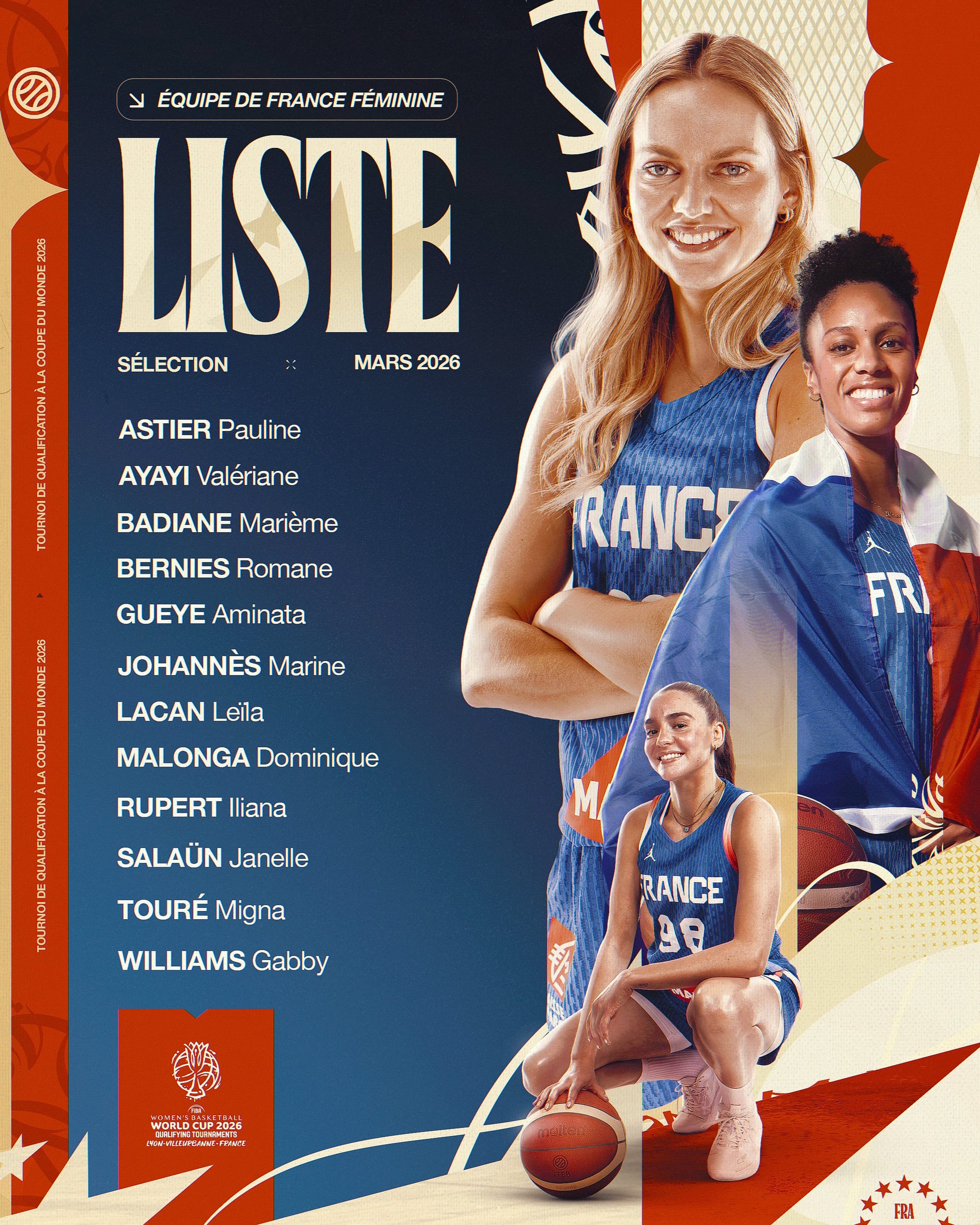 La Fédération Française de BasketBall (FFBB) a annoncé ce jeudi la liste des 12 joueuses retenues pour participer au Tournoi de Qualification à la Coupe du Monde 2026 (11 au 17 mars 2026).
