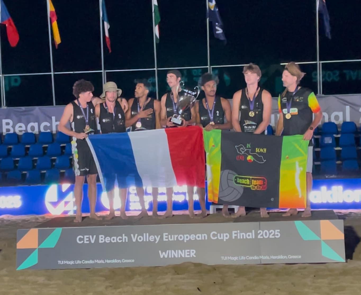 Ils étaient venus pour une médaille, ils repartent avec le trophée de la Coupe d’Europe des clubs 2025. Porté par son coach Loïc de Kergret, ancien passeur international, le Ré Beach Club a réalisé un tournoi quasi parfait. Après avoir dominé sa poule B sans concéder le moindre set, face aux Roumains de CSU Resita, aux Grecs du 4 Sports Club d’Athènes et aux Tchèques du BC Strahov, le collectif a confirmé en phase finale. En demi-finale, les Français ont fait plier les Ukrainiens de Sunrise Sports Academy, grâce notamment au duo Kéran Duval/Joadel Geneviève-Gardoque, qui s’est imposé au mental en trois manches (12-21, 21-16, 17-15). Le tandem Niels Philippe Daniel/Noubet Ngatum a ensuite bouclé la qualification (18-21, 21-12, 15-8), envoyant le club rhétais en finale européenne.